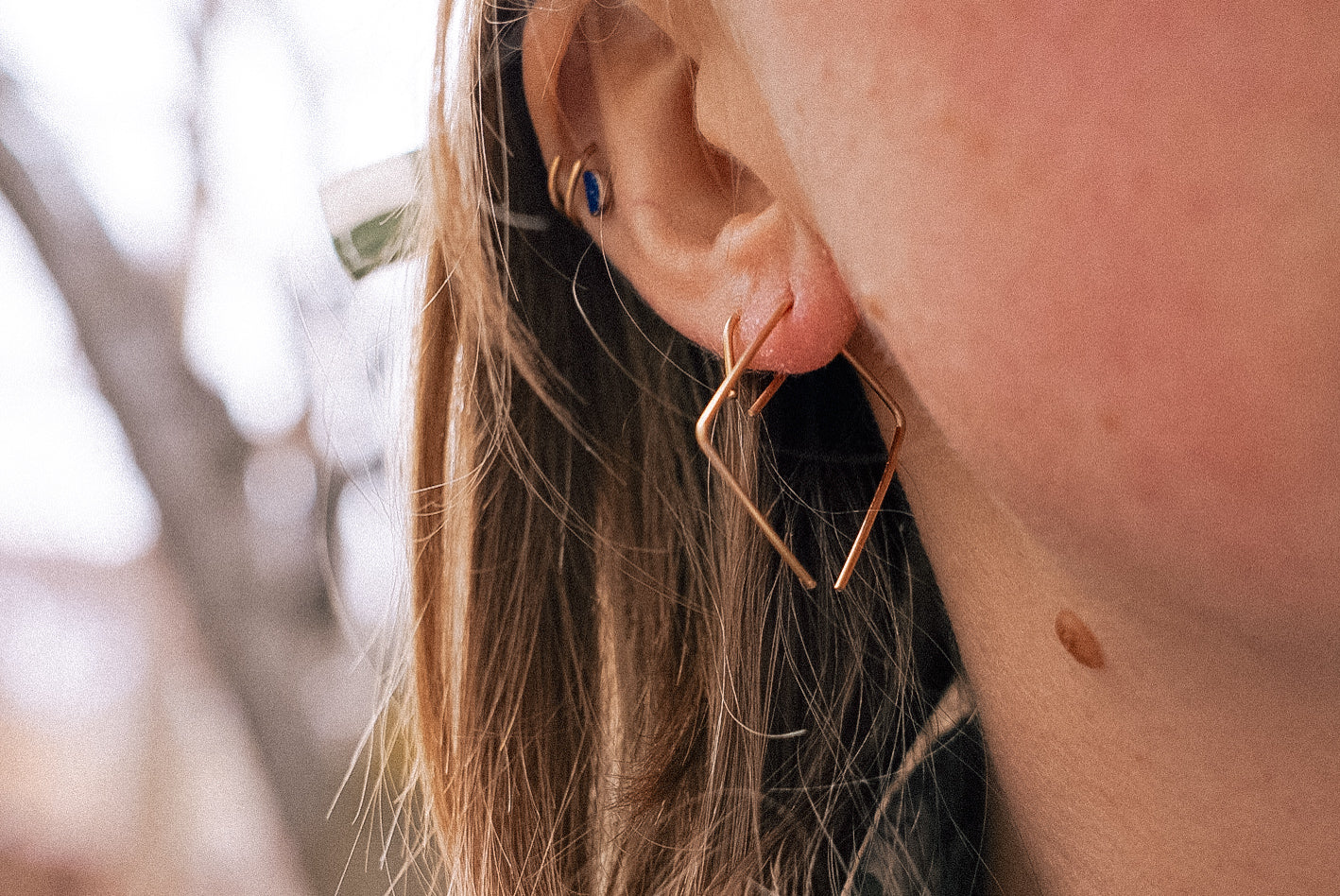 These handcrafted earrings are simple and will be your go to earring for any outfit. The thicker wire and curved design makes sure they will stay in when you're venturing each day.