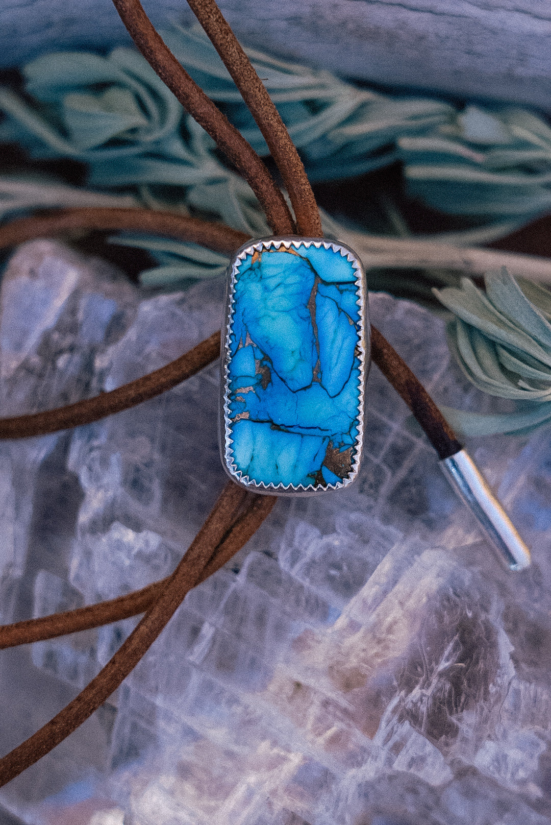 - Materials: Sterling Silver, brown leather, Turquoise Composite